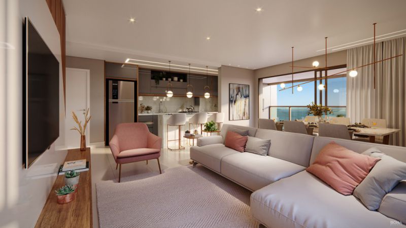 Apartamento amplo com living integrado, 3 dormitórios sendo uma suíte, sacada com churrasqueira com vista lateral para o mar.
